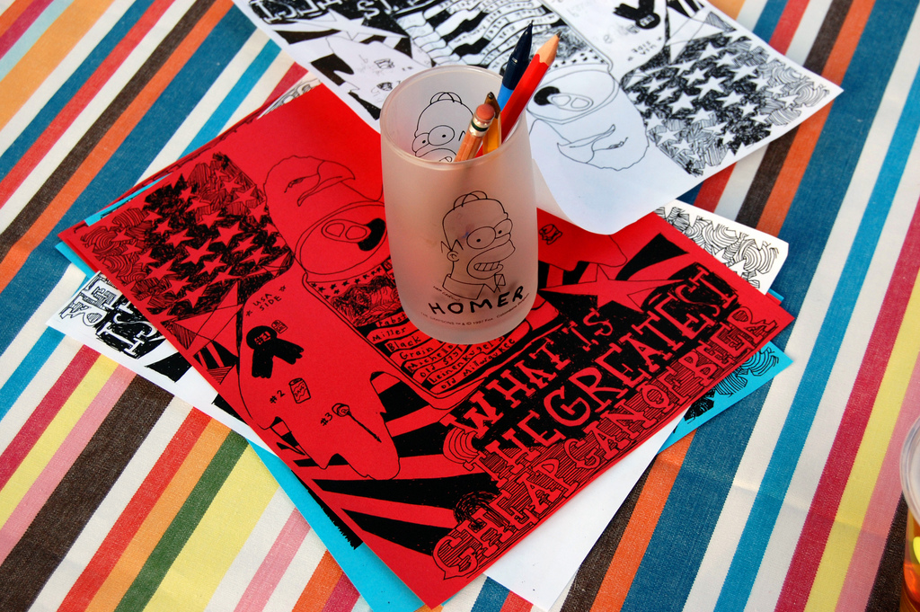 I've built up quite a few red, white and blue party decorations over the years. We use a few 36" red balloons, flag cupcake toppers and patriotic knick-knicks I pick up at the thrift store. Last year I made a cute paper globe garland a la this one from Sally Shim, but it only lasted a day before the intense humidity made all the balls droop. [Insert drooping-ball-joke-of-your-choice here.] It survived the party, though, which was all that mattered! I'm going to try to squish them back into shape, but I'm not optimistic.